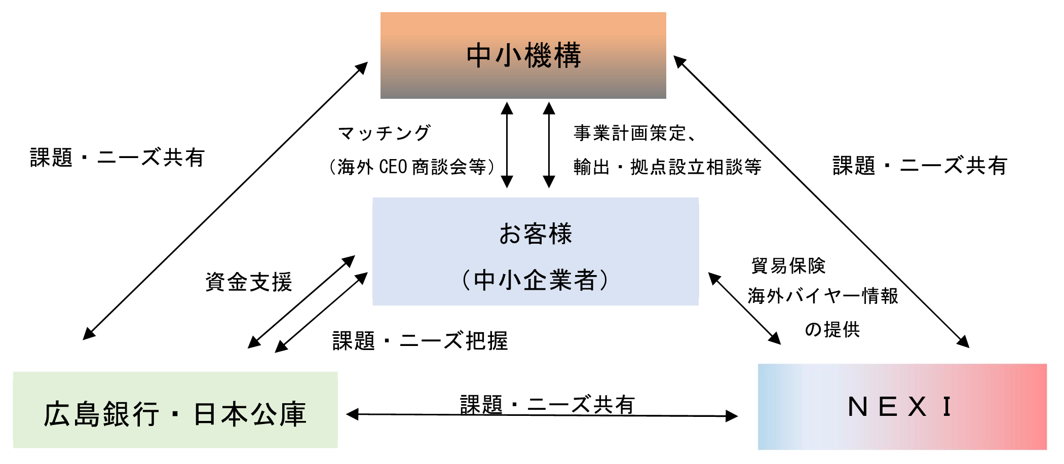 広島銀行、NEXI、日本公庫及び中小機構中国本部は、今まで以上に連携を強化し、海外展開に取り組む中小企業・小規模事業者への支援に積極的に取り組んでまいります。