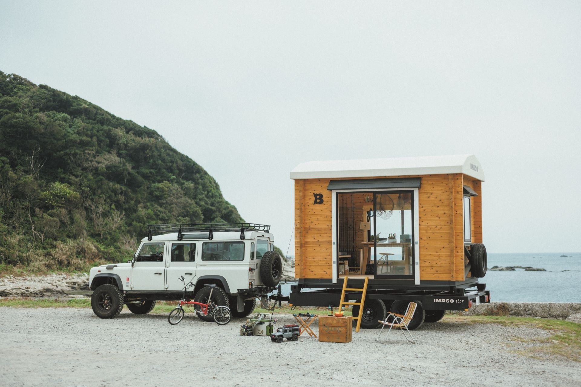 ‶走るログ小屋“IMAGOはBESSが2021年10月に新発売した車輪付きログ小屋商品。無垢の国産杉を使った存在感ある外観と、雰囲気ある室内が特長です。