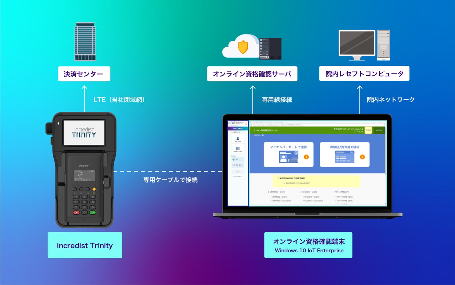 具体的にmyVerifist 医療エディションでは、当社Incredist Trinityを活用し、オンライン資格確認端末(Windows PC)に接続することで、健康保険証が統合されたマイナンバーカードを読み取り、オンライン資格確認を実施することが可能になります。またオンライン資格確認と共通画面の中で各種カード決済にシームレスに画面遷移することが可能で、各医療機関での受付からお会計まで1セットで対応が可能となります。