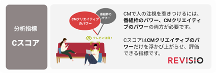 本ランキングに使われている「クリエイティブスコア(Cスコア)」は、クリエイティブを評価するためのもので、放送枠の平均的見られ方のCMに対して、どれくらいよく見られたかを評価するREVISIO独自の指標です。