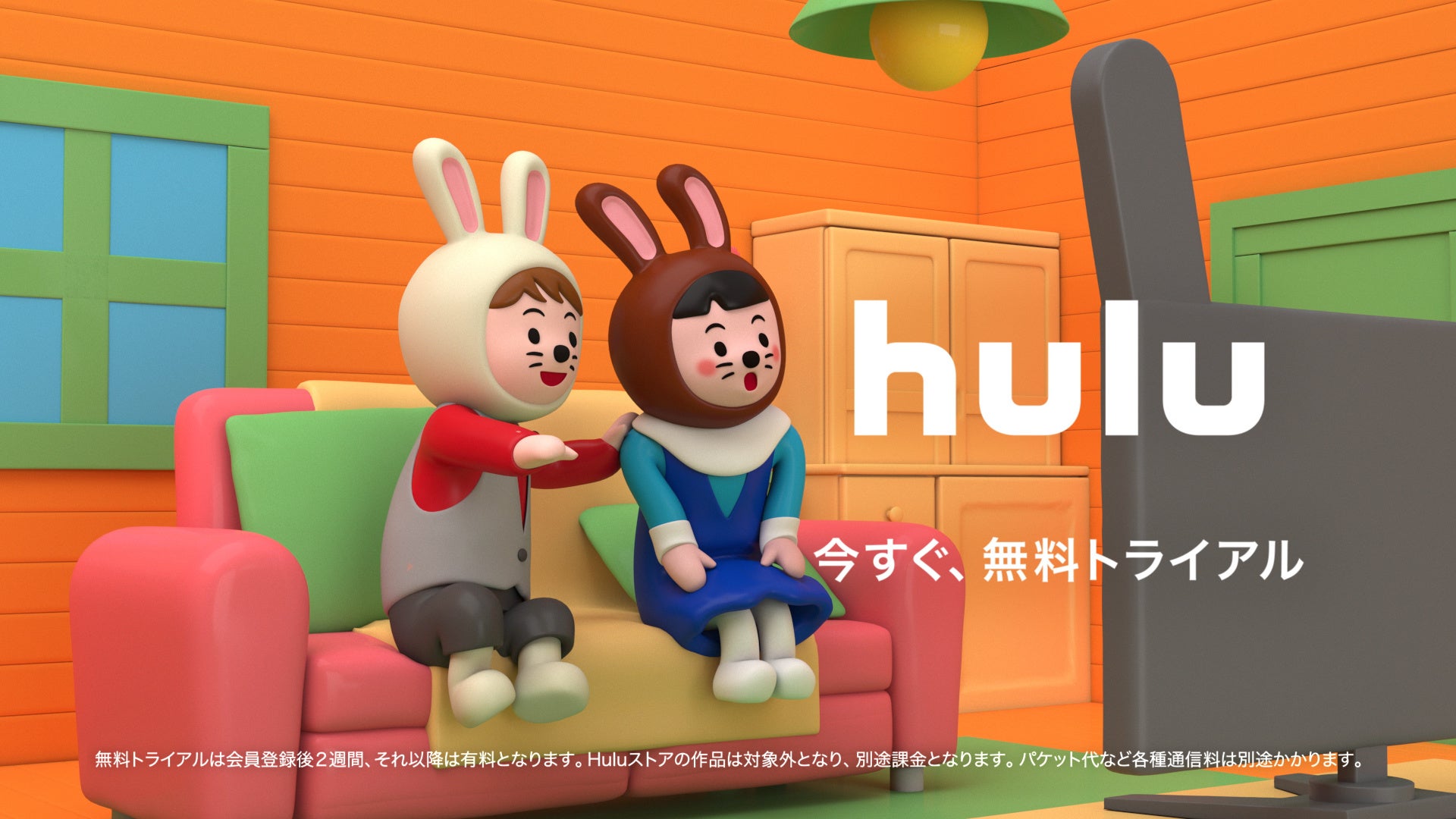 ウサギのフーとルーは、自分の好きな作品を観るためにテレビ画面の取り合いをしていますが、最後には二人で一緒にHuluを楽しむ、というコンセプトのCMです。どちらの作品を観るのかダンスをしながら取り合いをしている姿がとてもキュートです。今回のうさぎダンスは世界的に活躍する人気ダンスパフォーマンスグループ「s**t kingz」が担当しています。