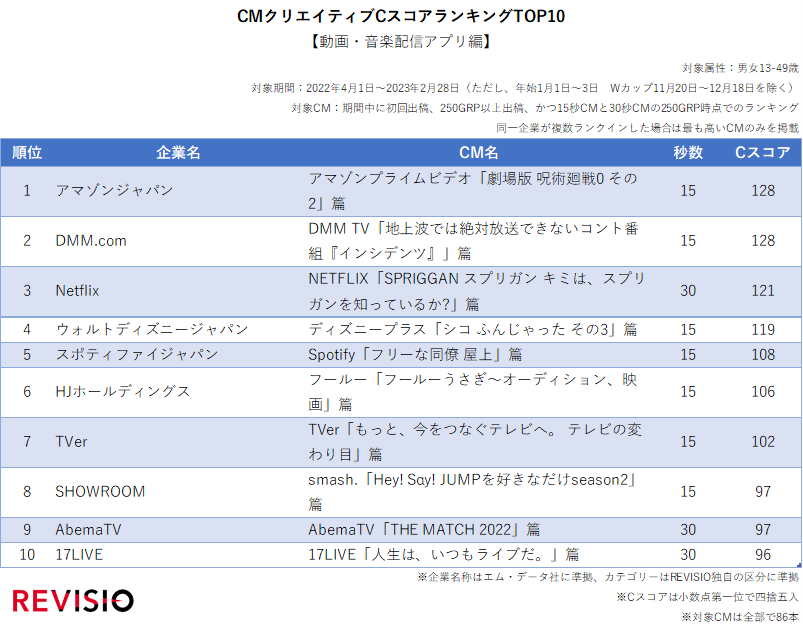 ご家庭に人体認識技術を搭載した機器を設置し、テレビの「視られている量」を測るREVISIO株式会社(旧TVISION INSIGHTS株式会社、所在地 :東京都千代田区、代表取締役社長 郡谷 康士、以下REVISIO)は、2022年4月から2023年2月の期間で、視聴者の視線を釘付けにしたテレビCMのランキング「CMクリエイティブCスコアランキングTOP10【動画・音楽配信アプリ編】」を公開しました。
