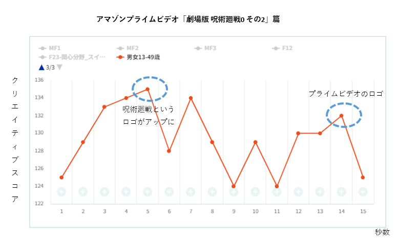 毎秒でのCMの注視は上図となりました。呪術廻戦のロゴ部分で一番注視が高くなりました。呪術廻戦だということが分かり、視聴者の目を惹いたと考えられます。また、いつものプライムビデオの音声とともにロゴが出る部分でも注視があがりました。通常ブランドロゴは注視が下がる傾向があるのに対し、最後のロゴ部分までしっかり見られていました。