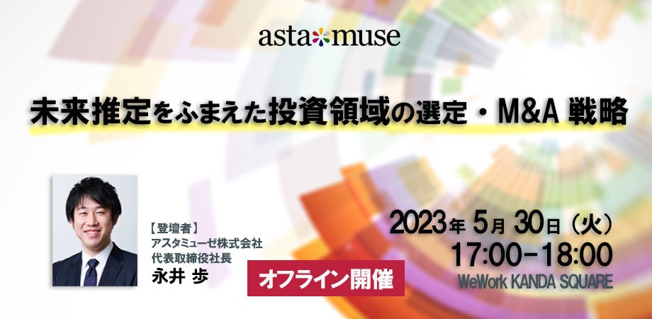 今回開催するウェビナー「未来推定をふまえた投資領域の選定・M&A 」では、世界中の社会課題・無形資産・イノベーション情報を統合した世界最大級のデータベースを保有しているアスタミューゼが、未来を構成する要素の客観的且つ定量的な分析から、その要素がいつ頃萌芽するか、実現するかなど、資金の流れ・人・ネットワークから分析する独自の手法をお伝えいたします。