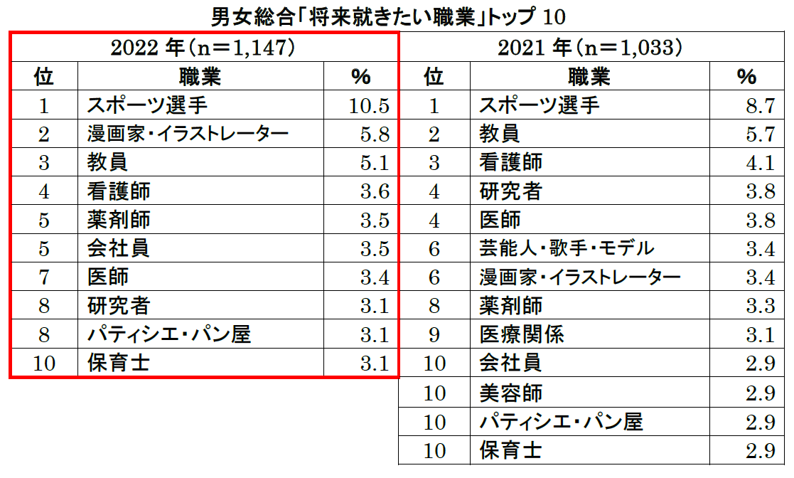将来就きたい職業の総合順位は、昨年に続き「スポーツ選手」が1位、女の子の間で人気が急上昇した「漫画家・イラストレーター」が2位となりました。10位以内の定番である人気の医療職では、「薬剤師」が8位から5位に順位を上げました。