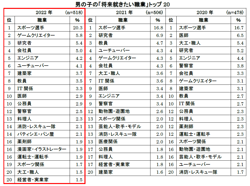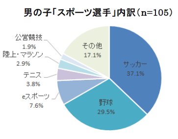 1位は今年も「スポーツ選手」で、全職業の中で最も比率を伸ばしました。内訳を見ると、サッカーが37.1%(昨年44.7%)、野球が29.5%(昨年23.5%)で、両者の差が10ポイント以上縮まる結果となりました。eスポーツは、2年連続で3位となり、子どもが憧れるスポーツに定着してきたと言えそうです。