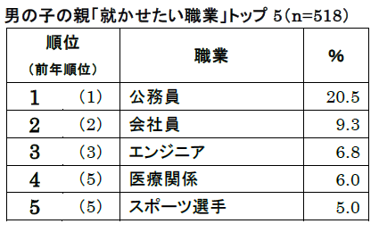 男の子の親が子どもに就かせたい職業は、昨年と同じく「公務員」がトップでした。4年連続で比率を上げています。