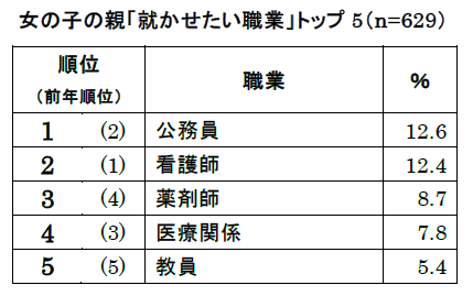 女の子の親が就かせたい職業は、コロナ禍で安定を願う気持ちが強まったのか、「公務員」がトップとなりました。そのほか、2位「看護師」、3位「薬剤師」、4位「医療関係」といった医療職も、昨年に続き上位となっています。