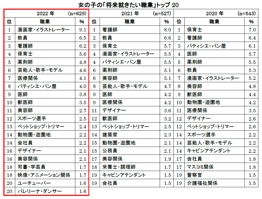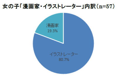 女の子が就きたい職業は、「漫画家・イラストレーター」が初の1位になりました。内訳はイラストレーターが8割を占め、活躍の場が広がり、アートとしても注目を集める“絵師”の仕事に憧れる女の子が増えているようです。そのほか、子どもたちにも身近な教育・医療系の資格職が並びました。