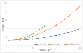 「低抵抗率仕様」は、「標準仕様」の表面抵抗率が150Ω/□であるのに対し、30Ω/□にすることで同じ印加電圧ではより広い面積で、同じ面積ではより低い印加電圧で発熱することが可能です。自動車市場やモバイル機器市場など幅広い分野で利用可能です。