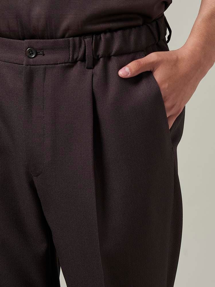 スポーツウェアのような軽量感、高ストレッチ、高通気を兼備した夏向けのメッシュ調生地に、インポート生地の上品なデザインを細部までプリントで表現し、高機能でありながらドレッシーな仕上がりを実現。ラクさだけではなく、スタイリングの主役を目指したデザイン性にもこだわりのある一着です。