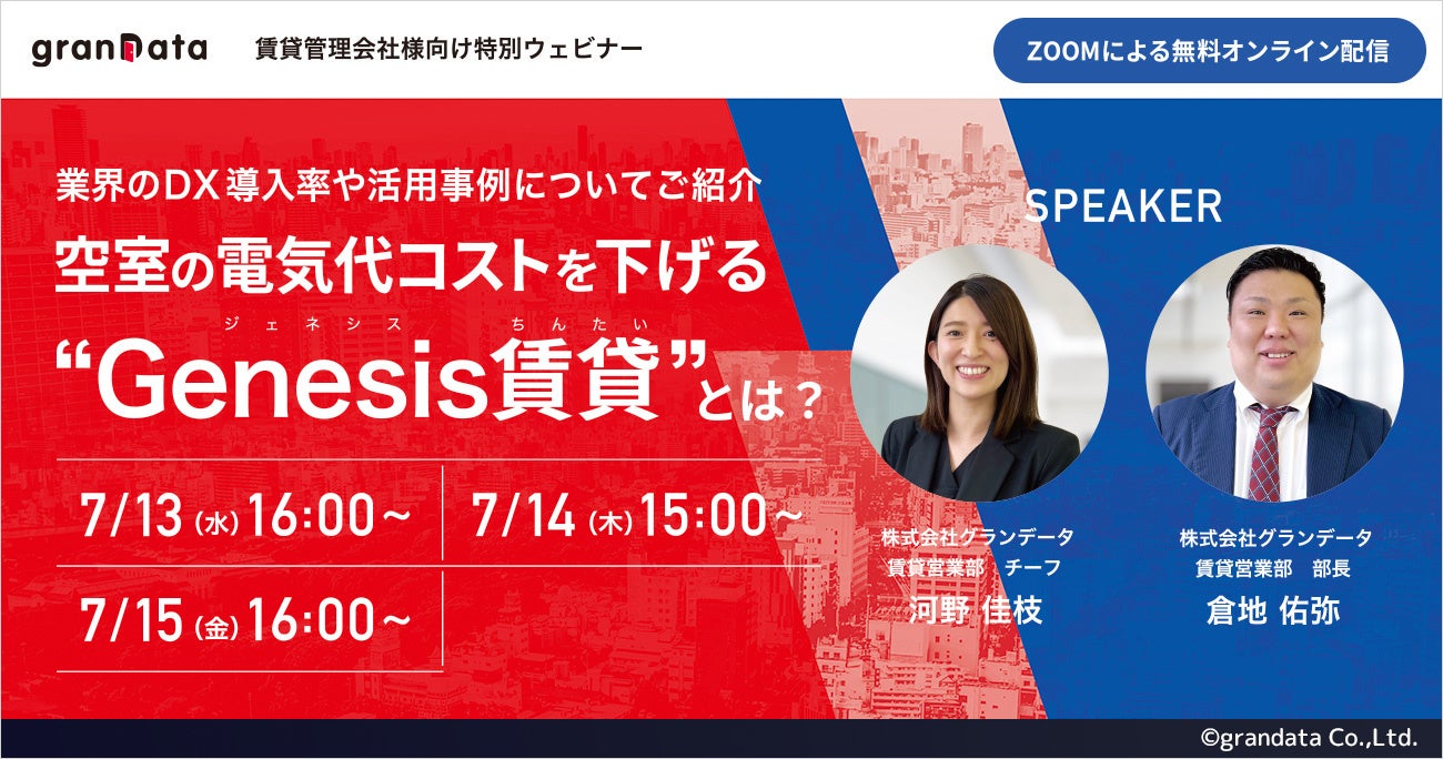 そこで今回は、2021年10月のサービスリリース以来、急速に導入シェアを伸ばしてきたグランデータが、現在の不動産業界におけるDX導入率についてのご説明や、業務プロセスの改善に関するご提案、空室の電気代コストを下げる「Genesis賃貸」(https://genesischintai.com/)のご利用方法・コスト削減の事例などについてご説明させていただきます。