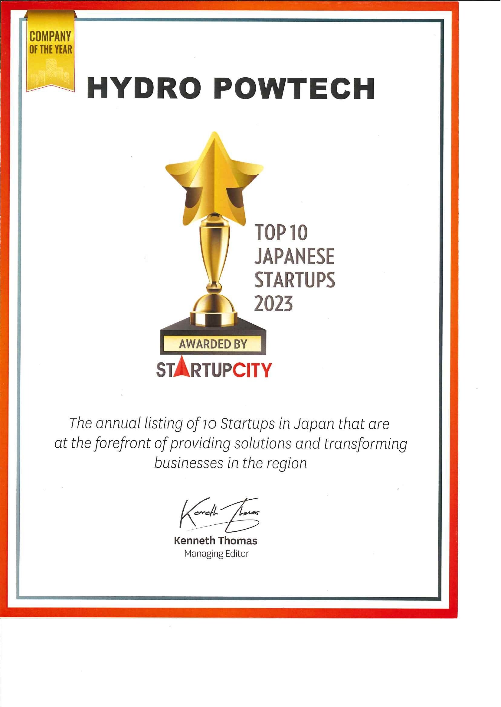 日本ハイドロパウテック株式会社(以下NHP)はアメリカ・サンフランシスコで投資家向けに情報を提供するStartUp City 社によって 「 TOP 10 JAPANESE STARTUPS」 及び「Company Of The Year in Japanese Startups 2023」に選出されました。