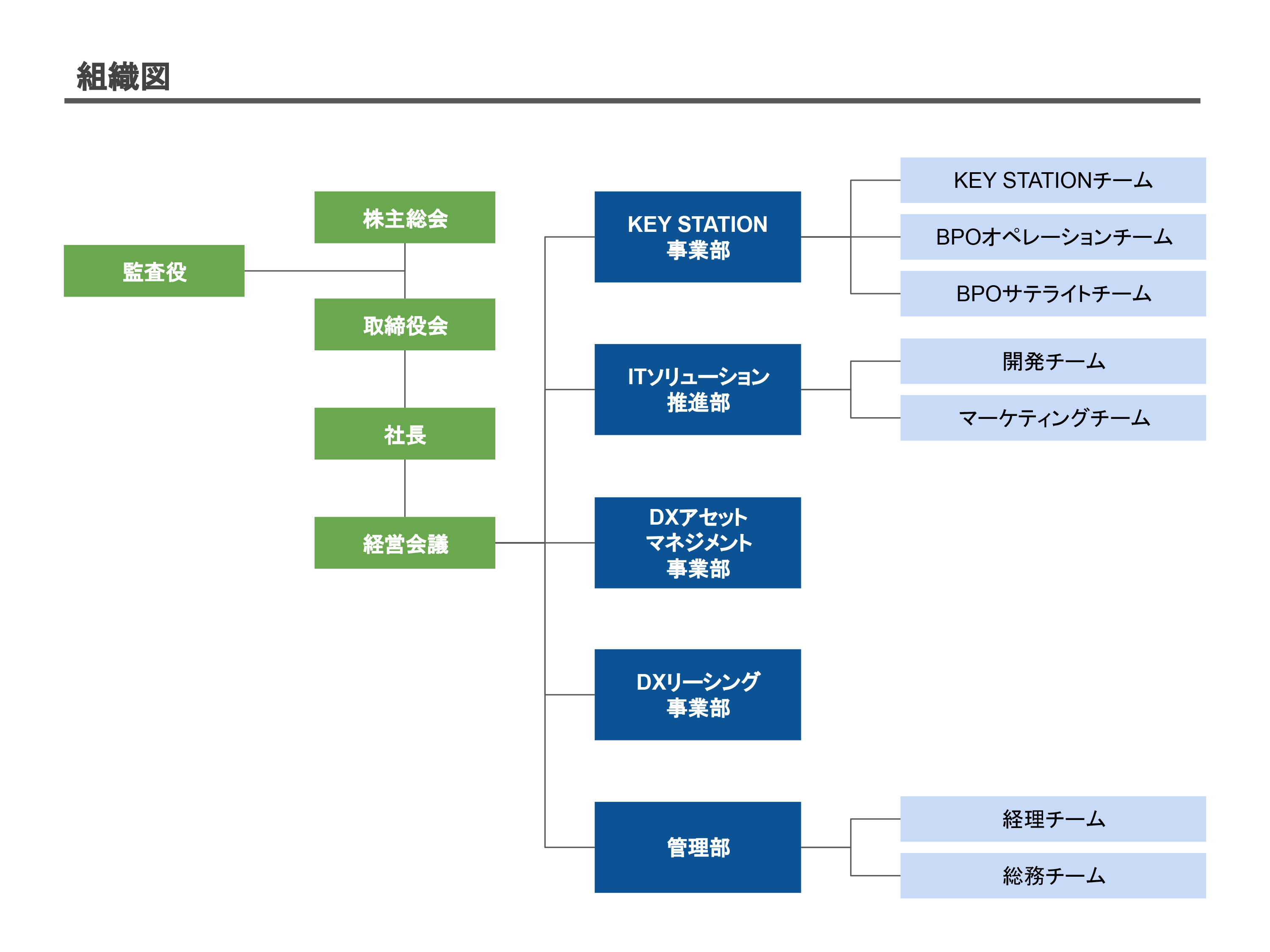 当社は、経営の効率化や経営管理機能の強化、グループシナジーのさらなる強化等を目的として、「KEY STATION事業」に関わる部門を並列に配置いたします。また、健全な経営活動を担保するために「取締役会」の設置及び「監査役」を設置致しました。