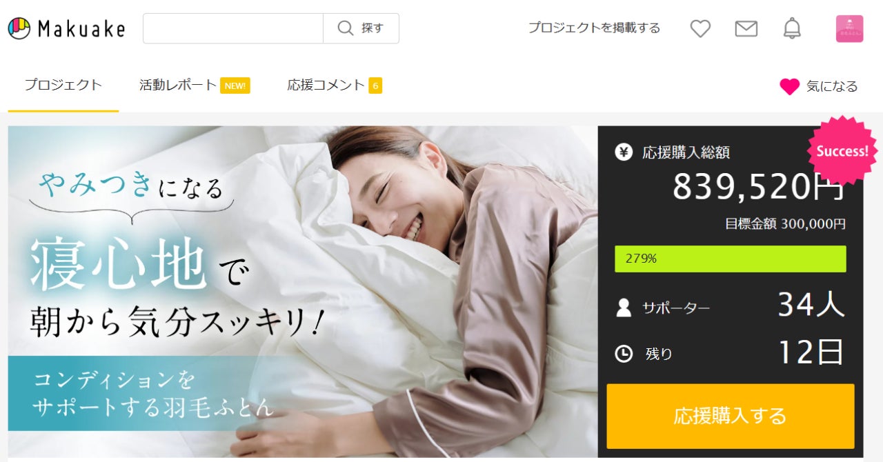 Makuakeで開始した『コンディションをサポートする羽毛ふとん』のクラウドファンディングは、プロジェクト開始からわずか1日間で目標金額を達成し、応援購入総額が80万円を達成しました。