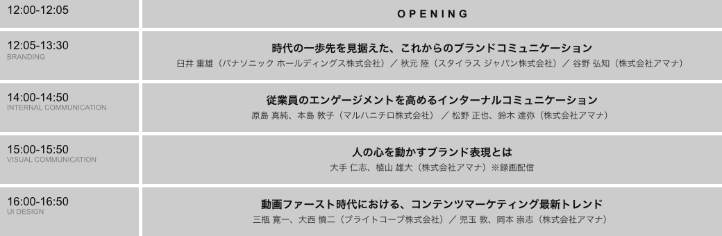 企業のあらゆるコミュニケーション課題に向き合い、その解決方法を探る、アマナ主催のイベントです。毎回さまざまなテーマを切り口に、先進企業の方々をゲストに迎えたトークセッションや講演、マーケットの今と未来をとらえたセミナーをお送りしています。