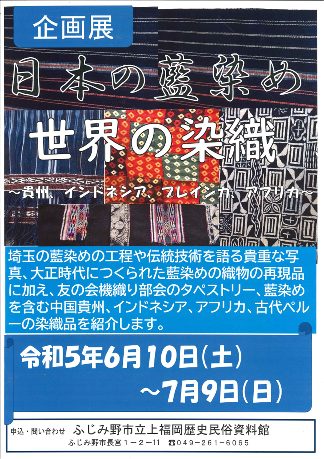 展示では、「藍染め」にまつわる糸や布などを染める職人「紺屋」がいたことなどを学ぶとともに、日本ペルー交流150周年にちなみ、世界最古の藍染めを生み出した古代ペルー(ナスカなどプレインカ)、アフリカ、インドネシア、中国貴州の染織品を紹介します。