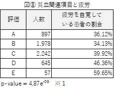 相関は病気だけに限らない。「貧血関連項目」においては、問診で「体がだるい」、「帰宅後は疲れてゴロゴロしている」、「風邪をひきやすい」のいずれかにチェックを入れた患者は評価Aで36.12%、評価Eで59.65%という結果となり、既に日常生活で疲れを感じている患者に対してヘム鉄のサプリメントを推奨しているが、それを裏付ける結果となった。(図⑧参照)