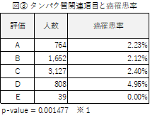 例えば、「タンパク質関連項目」において評価Aだった患者の癌の罹患率が2.23%であったのに対し、評価Dの患者は4.95%であった(図③)。