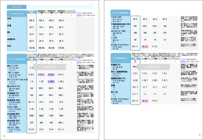 今回のリニューアルでは、検査結果の解析の精度を向上させ、評価項目を5つに分類し、さらに血液検査項目では10の関連項目に分け、それぞれをA~Eの5段階で評価します。項目間の関連を考慮した上で医師が診療上重要視する項目に比重を高く置き、加えて、主観を除くためにAI技術を用いて多面的に評価計算を行います。