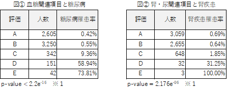 尿素窒素、クレアチニン等を含む「腎・尿関連項目」では、評価Aだった患者の腎疾患罹患率が0.69%であったのに対し、評価Dの患者で58.94%、評価Eは100%の罹患率となった(図②)。