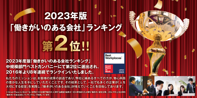 Great Place to Work® Institute Japanが主催する2023年版「働きがいのある会社(従業員100-999人部門)」ランキングにて、ベストカンパニーとして第2位にランクイン。2016年から、8年連続のベストカンパニー選出となっています。さらに、同ランキング内の「若手(2022年度)」部門でも中規模ランキング4位へのランクインを果たしています。