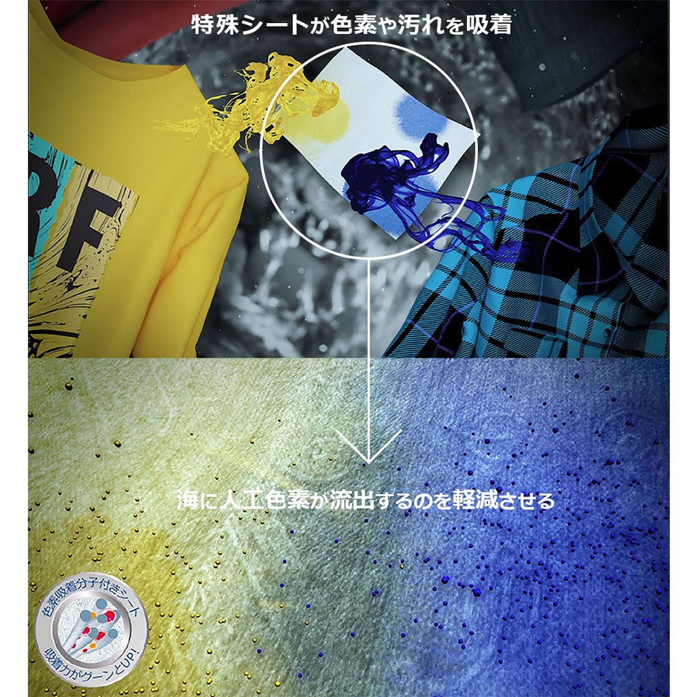 洗濯時に1枚入れるだけで、特殊シートが洗濯水に浮き出た色素や汚れを素早く吸着し、色移りやくすみを防止します。
