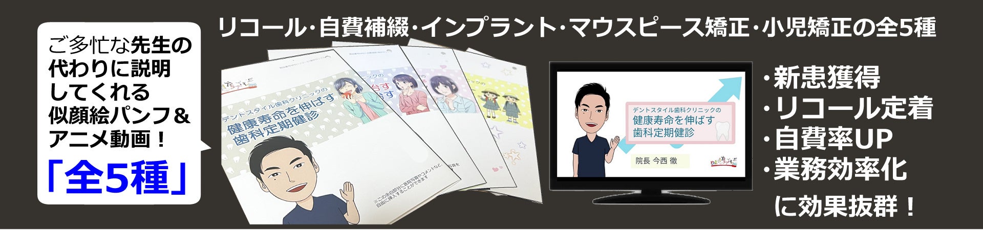 新患獲得・リコール定着・自費率アップ。どれを実現するのにも欠かせないのが患者様に手渡しする配布ツールや待合室やホームページ、SNSなどで配信する動画ツールです。しかしそのツールも各医院のオリジナリティが無ければ効果は上がりません。株式会社デントスタイルの楽歯隊シリーズは、ツールの内容はもちろん、そのツールをどのように使用すれば効果が上がるのか。またツールを使うことにより今の仕事を楽にすることを徹底研究しながら制作しているドクターサイドのツールです。でも漫画やアニメの内容はあくまで患者目線。歯科医院の評判を落とす事なく、無理せず自費治療をPRすることが叶うツールとなっております。制作費用が安く、納期も早く、打合せなども不要。先生の手間が掛からないことも大きく評価されています。日本全国無料出張デモを定期的に開催しております。お問い合わせは株式会社 デントスタイル、担当今西まで。電話0561-42-5580 公式サイト https://www.dent-style.net/