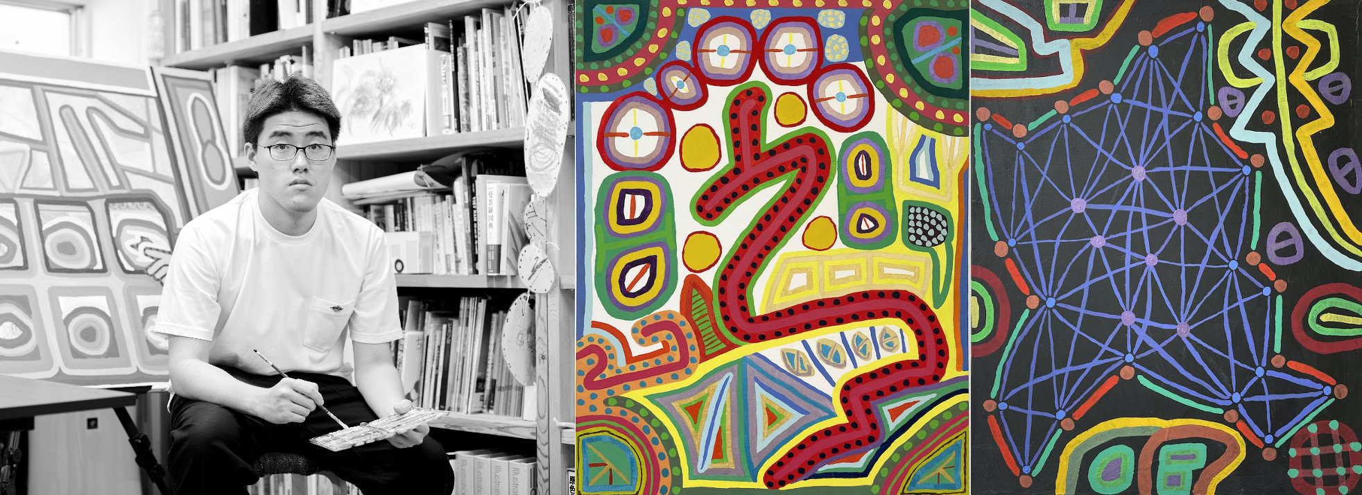 通っていた施設の本棚にあったマグリットの作品集に出会い、15歳の時に絵画制作をはじめる。書いたアートを見てもらうことが喜びであり、ひとつひとつの線を、かたちを、驚異的な集中力で描く。その集中力は人から話しかけられても気づかないほど。小さいものから大きなものまで特徴的な色彩感覚で、キャンバスを埋め尽くす。どこかエスニックでありながら、神秘的な彼の作品群は老若男女幅広い視線を集める。