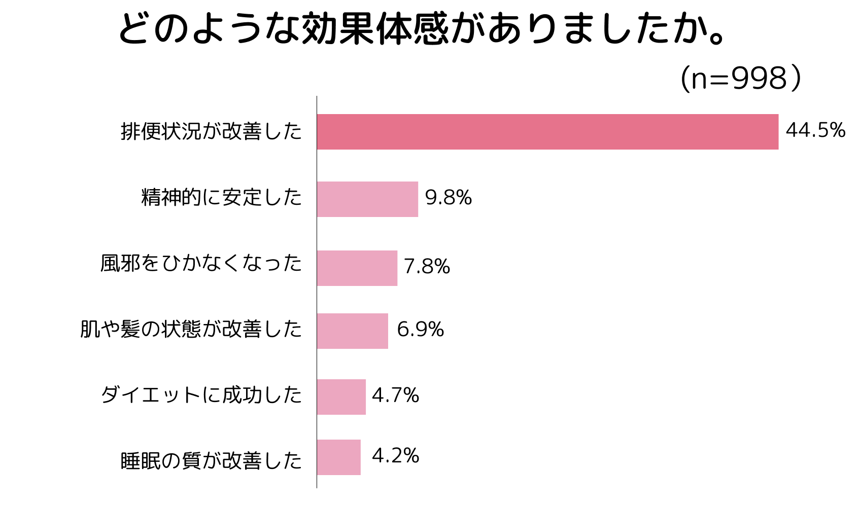 腸活によって実感している効果で最も多いのが「排便状況の改善」で44.5%となり、お腹の調子に悩みを持つ人が多いウンログユーザーにとっては、腸活は有効な改善手段になっていることがわかります。他にも、「精神的に安定した(9.8%)」や「風邪をひかなくなった(7.8%)」など、腸とは直接的に関係がなさそうに見える効果についても変化を感じる人が一定数いることがわかります。