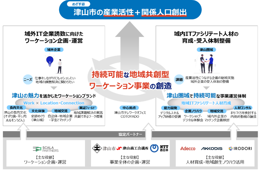 連携する各企業は、ICTの利活用や地方創生に資する事業ノウハウ、新しい働き方に着目した事業など、各々の強みを活用し、津山市地域の皆様とともに、津山の魅力を活かしたワーケーションブランドを立ち上げます。また、ワーケーション事業を地域で持続可能な営みとしていくために、地域のIT化を牽引し、地域内外をつなげるITファシリテート人材の育成に取り組みます。