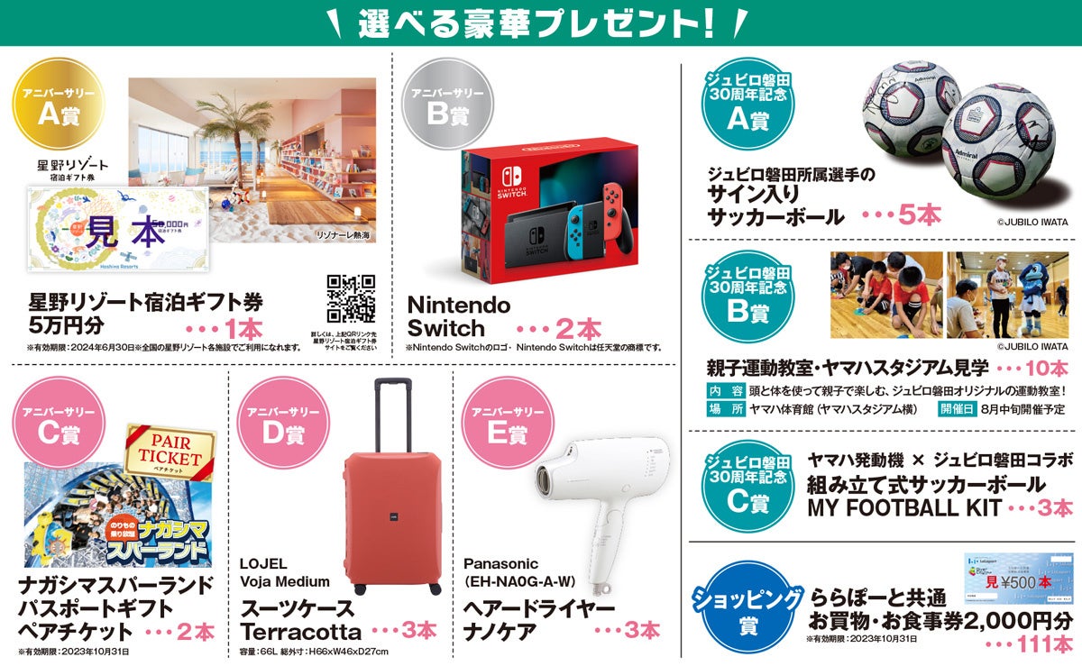 ららぽーと磐田は2023年6月で開業14周年を迎えます。今年の周年祭では、静岡県磐田市をホームタウンとするプロサッカークラブ「ジュビロ磐田」や、静岡県磐田市に本社がある「ヤマハ発動機株式会社」とコラボレーションした、地域ならではの特別イベントを多数ご用意しております。また、期間中お買い物いただいた方に豪華景品が当たるプレゼントキャンペーンも実施致します。ぜひ、この機会にららぽーと磐田へご来館ください。