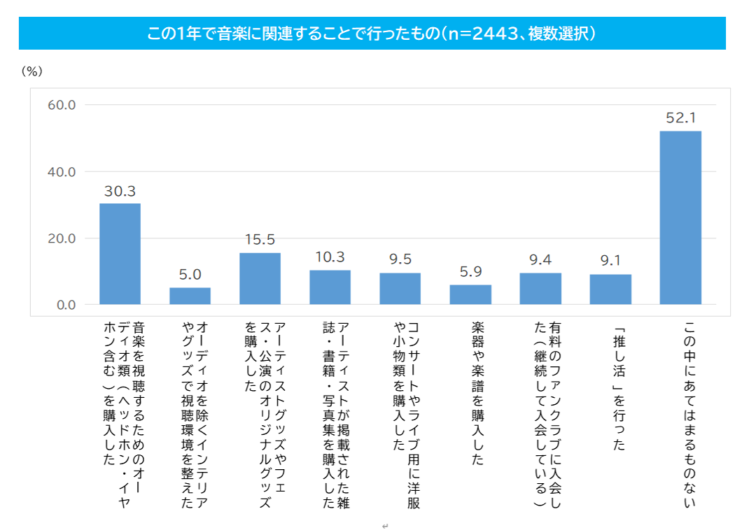 「音楽を聴く」こと以外の「音楽に関連する行動」では、「音楽を視聴するためのオーディオ類(ヘッドホン・イヤホン含む)を購入した」が30.3%、「アーティストグッズやフェス・公演のオリジナルグッズを購入した」が15.5%の回答となりました。