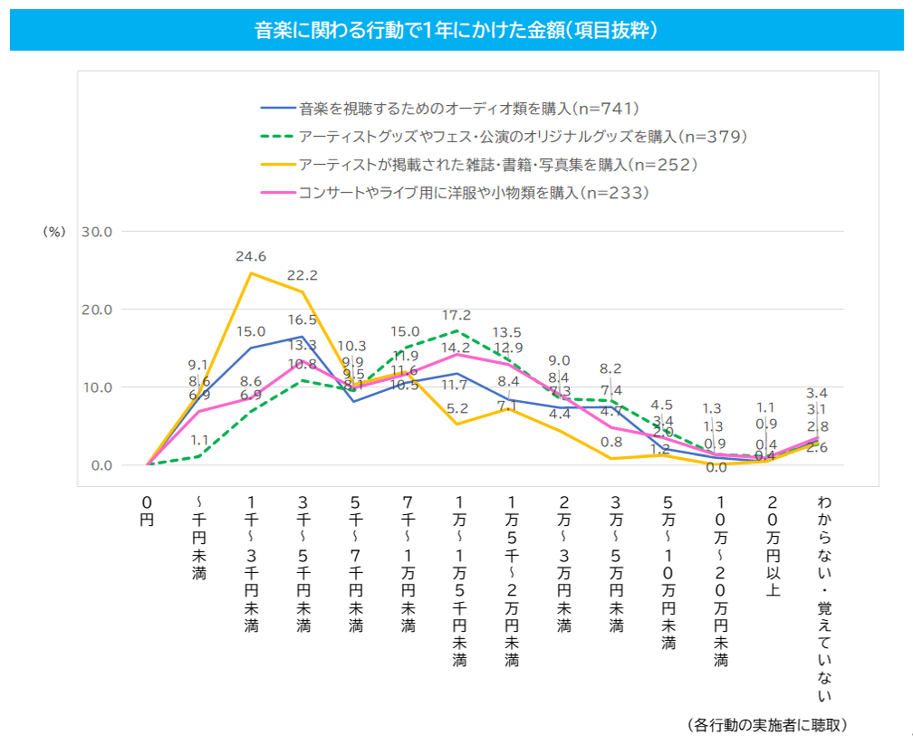 音楽に関連する行動に、1年間でどの程度お金をかけているか見ていくと、「音楽を視聴するためのオーディオ類(ヘッドホン・イヤホン含む)を購入」は、「1000円~3000円未満」「3000円~5000円未満」が多くなっていますが「3万~5万円」まで広く分布しています。「アーティストグッズやフェス・公演のオリジナルグッズを購入」は「1万円~1万5千円未満」が最も多く、他の行動と比較すると高額の利用者が多い傾向が見られます。