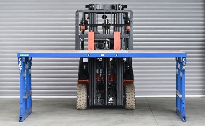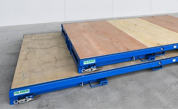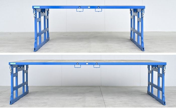 フォールド・デッキは、フォークリフトで持ち上げるだけでカンタン組み立て・カンタン折り畳みができます。