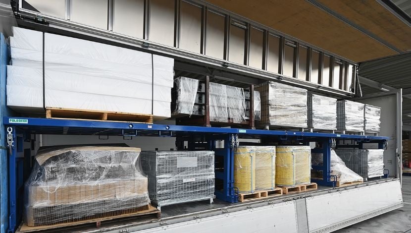 トラック2台分の荷物を1台に集約して運搬できるフォールド・デッキはトラックの台数はそのままに、積載効率を最大2倍に上げることができます。