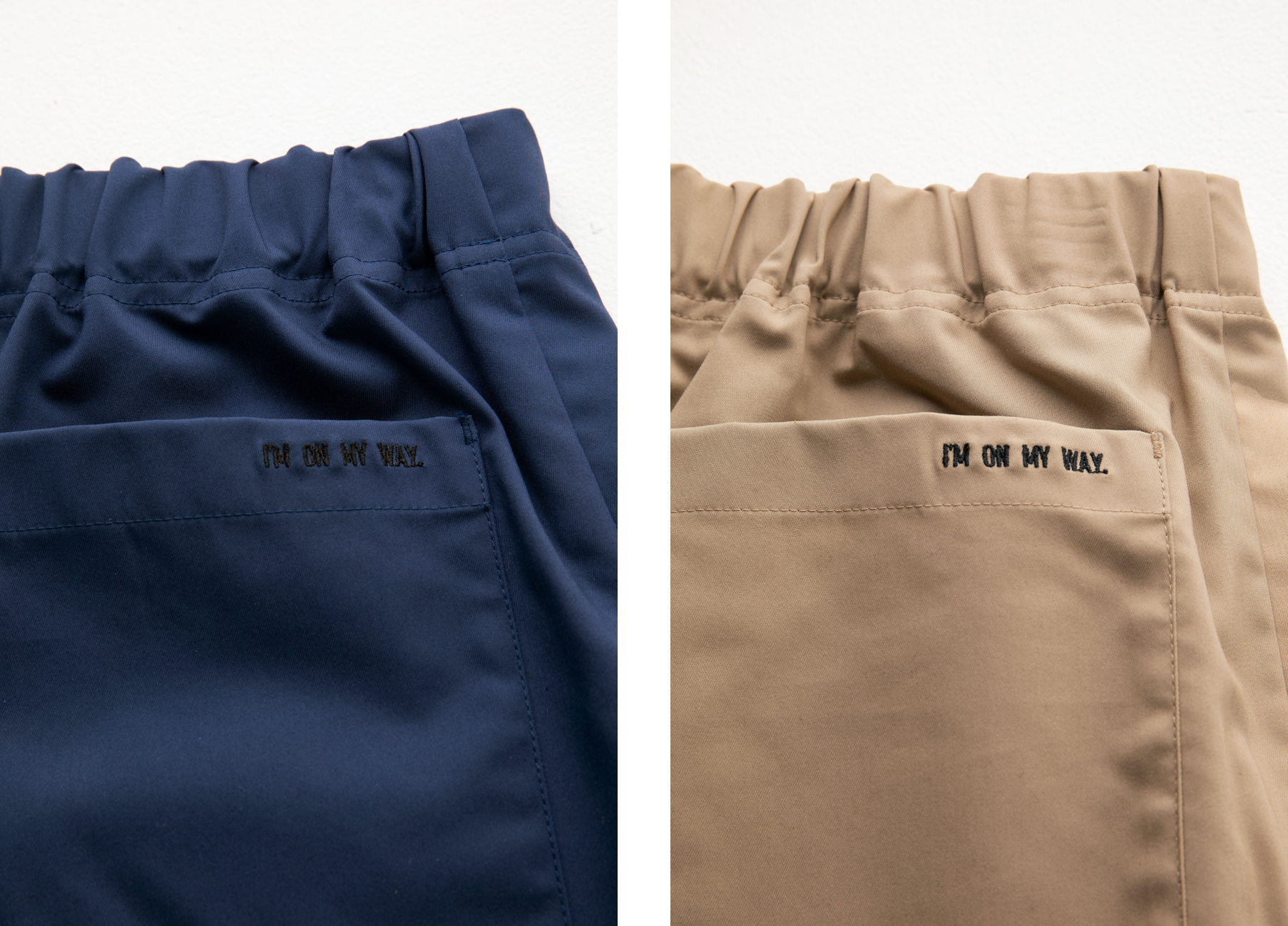2色のパンツともに後ろポケットに「今、向かっているよ!」という心強いメッセージ「I’m on my way」の刺繍を施しています。