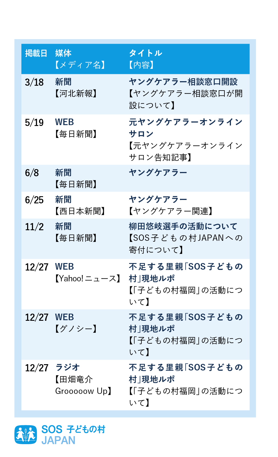 「ヤングケアラー」に関する社会的関心が高く、多数メディアに掲載されました。