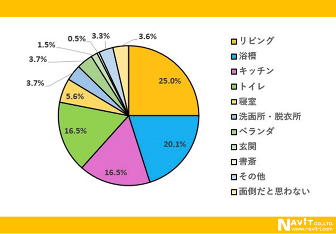 家の中で最大面積を占めることが多い「リビング」が25%となっています。続いて水回りの「浴槽」20.1%、「キッチン」16.5%、「トイレ」16.5%となっています。