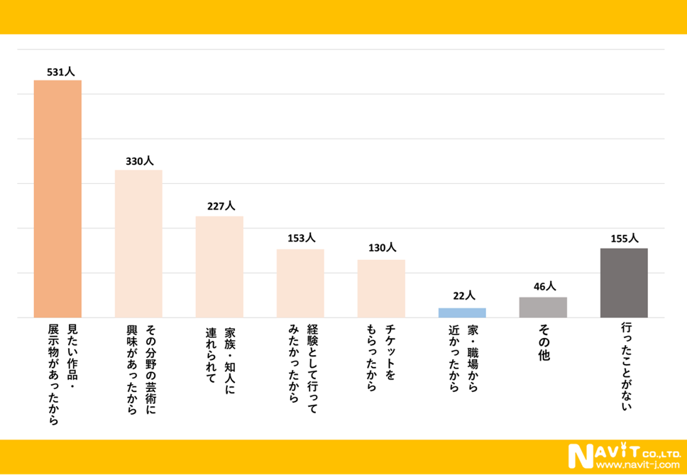 「見たい作品・展示物があったから」が531人(33.3%)です。やはり見たい展示があったら足を運びたくなります。次に「その分野の芸術に興味があったから」が330人(20.7%)と続いています。興味があるジャンルを見に行って新しい作品に出会う感覚は、また格別です。「家族・知人に連れられて」が227人(14.2%)と続いています。1人でゆっくりと芸術鑑賞するのもいいですが、見終わって喫茶店などで見たものについて語り合う相手が欲しいのかもしれません。