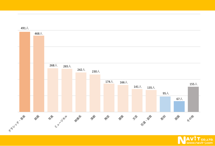 一番関心が高い芸術が「クラシック音楽」の491人(16.9%)となっています。次に「絵画」が468人(16.2%)、「写真」が268人(9.3%)と風景や情景を切り取って描かれる芸術に票が集まっているように感じます。