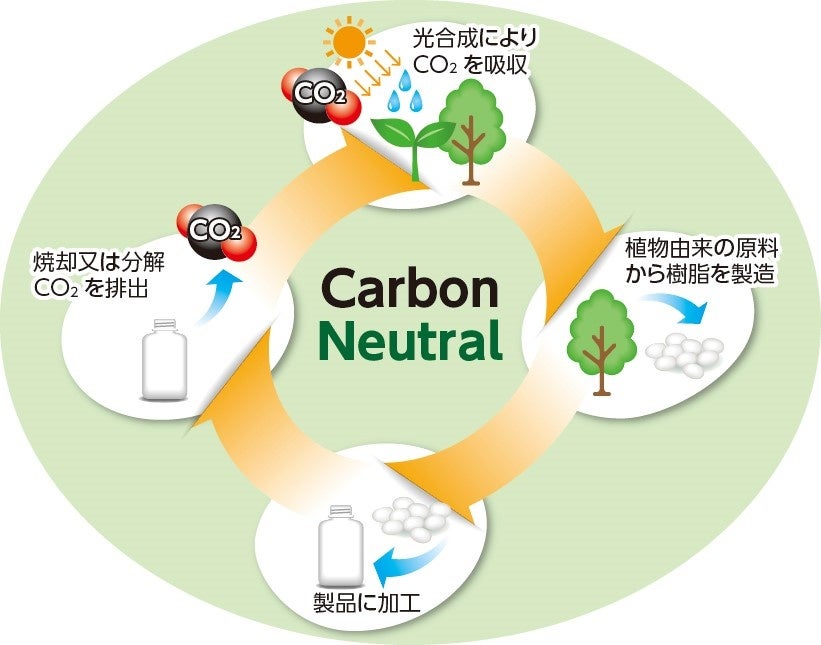 植物は成長過程で光合成をおこない、大気中の二酸化炭素を吸収しているため、植物由来原料を使用したバイオマスプラスチックは焼却しても全体では二酸化炭素が増加しないというカーボンニュートラル特性を持っています。
