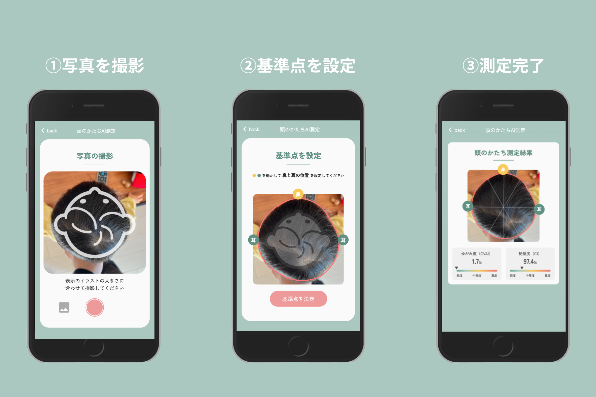 そのような悩みを解消するために、医師監修のもと、どこでも、誰でも簡単に測定でき、ゆがみ度がひと目でわかる「頭のかたちAI測定」を開発いたしました。また、測定して終わりではなく、頭のかたちに関するきちんとした情報も併せて提供しています。