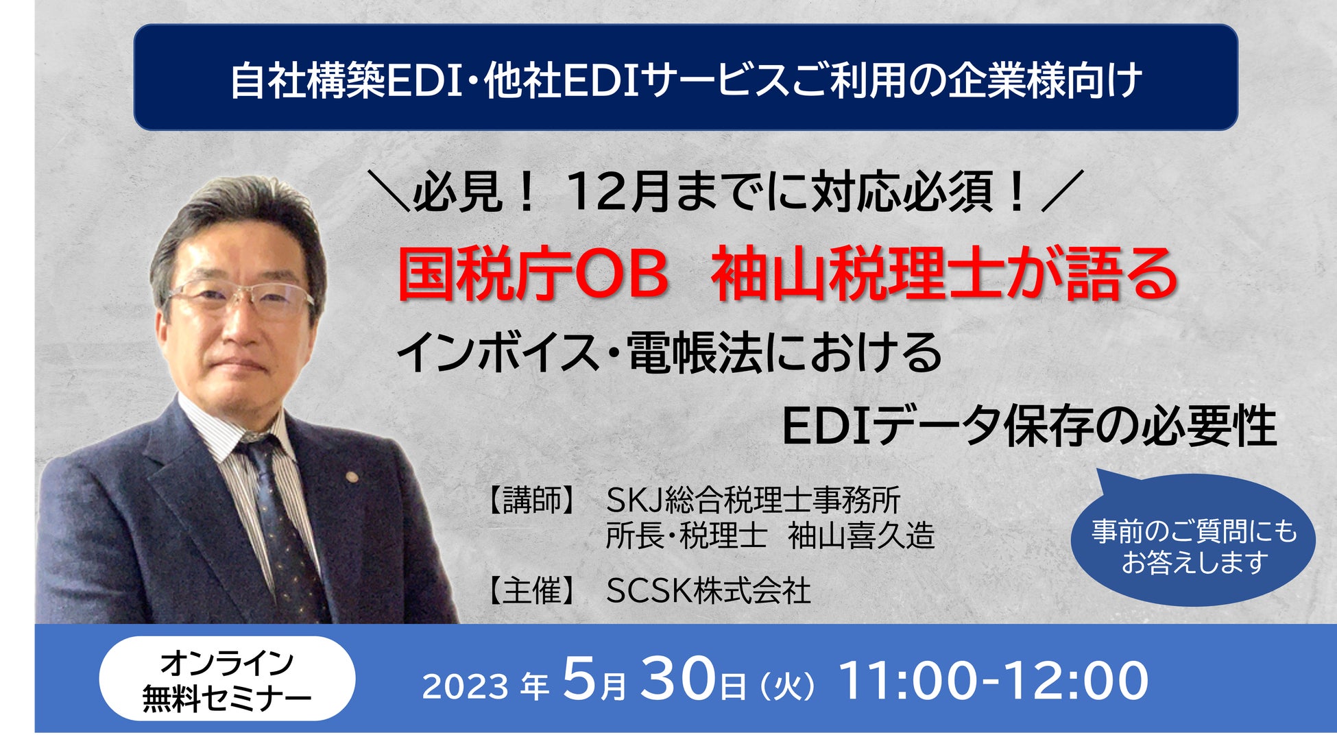 本セミナーでは、SKJ総合税理士事務所 所長の袖山税理士より、盲点となりがちなEDIデータの保存と準備すべき事項をご説明いただきます。また、SCSKからは自社構築EDI・他社EDIサービス問わずご利用いただける、EDIデータ保存サービス『スマクラデータアーカイブ』をご紹介いたします。
