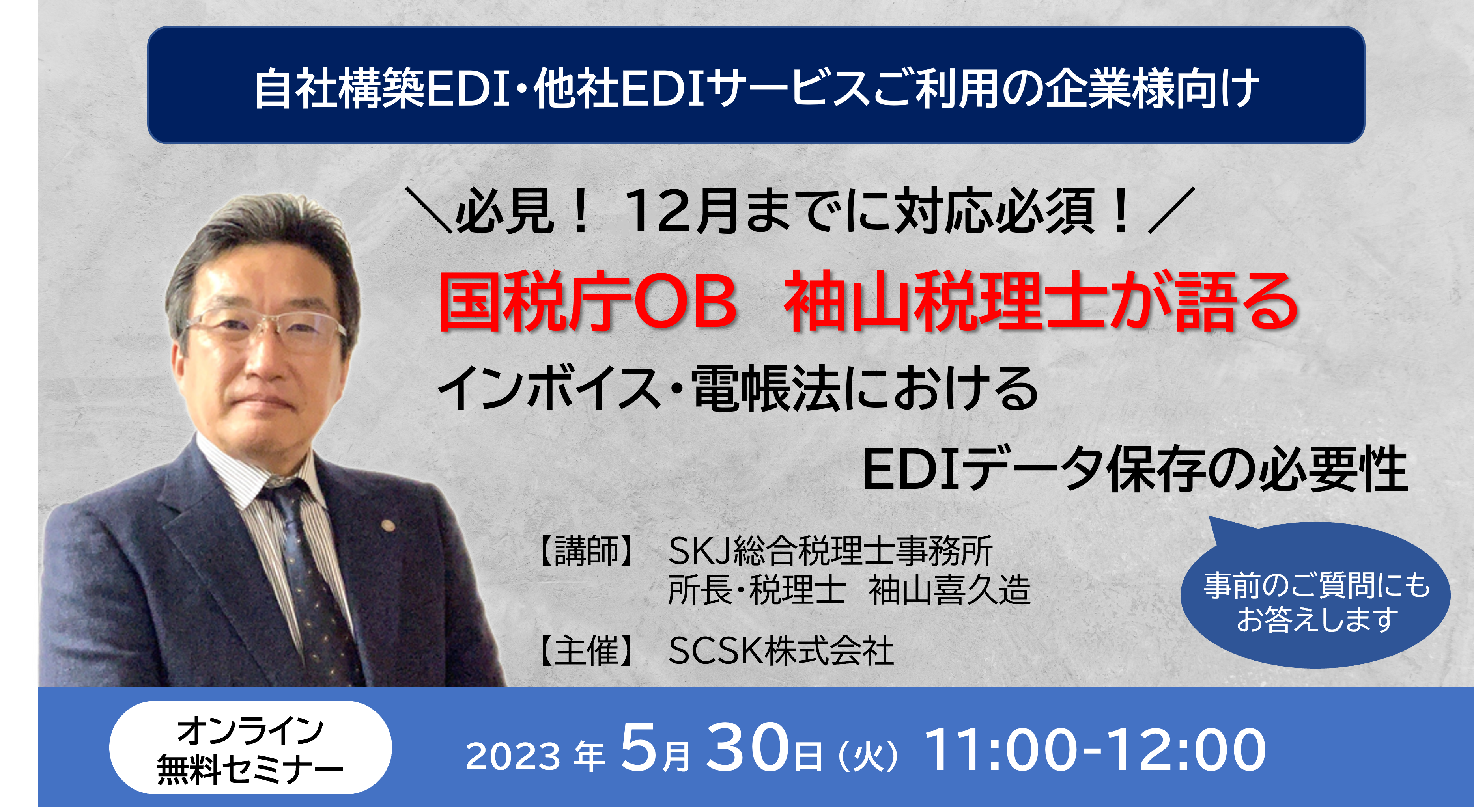 本セミナーでは、SKJ総合税理士事務所 所長の袖山税理士より、盲点となりがちなEDIデータの保存と準備すべき事項をご説明いただきます。また、SCSKからは自社構築EDI・他社EDIサービス問わずご利用いただける、EDIデータ保存サービス『スマクラデータアーカイブ』をご紹介いたします。