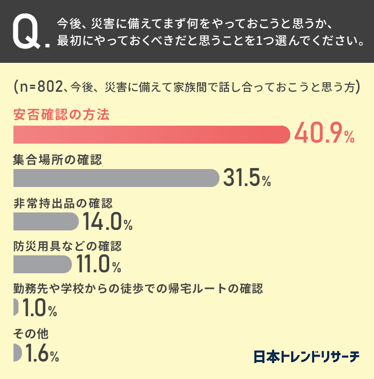 「今後、災害に備えて家族間で話し合っておこうと思う」と答えた方の40.9%が、今後、災害に備えてまず「安否確認の方法」を決めておくべきだと思っている、と回答しました。
