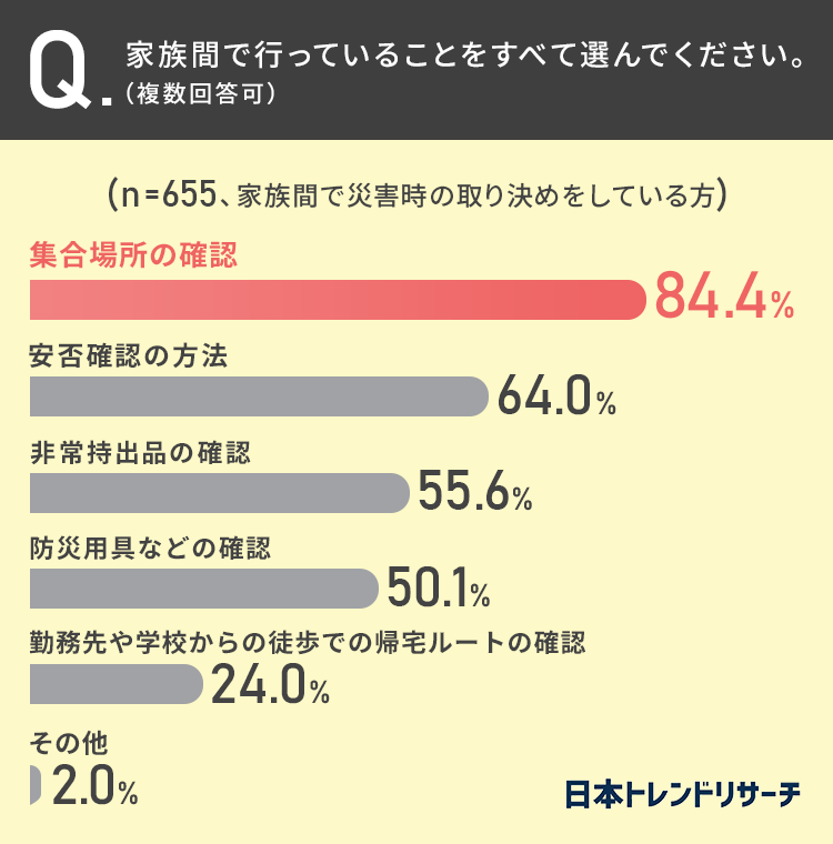 39.7%が、災害が起きた場合にどうするか家族間で「決めている」と答えており、「集合場所の確認」は84.4%の方が行っている、とのことです。