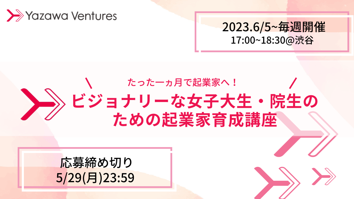 シード特化の独立系VCであるYazawa Venturesは、ワークとレクチャーを通じて、約一ヵ月でビジネスプランを作ることを目指す『たった1ヶ月で起業家へ!ビジョナリーな女子大生・院生のための起業家育成講座』を開催いたします。