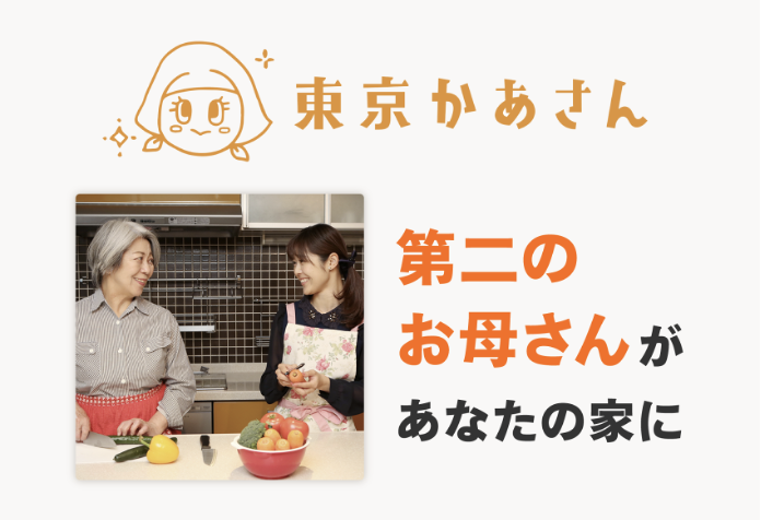 “東京にもう1人のお母さんを” をコンセプトにした、総合的なご家庭サポートサービスです。熟練主婦が個人家庭に訪問し、家事代行やベビーシッターの枠を超えて、掃除・洗濯・買い物・料理・食器洗い・子育てのヘルプ・送迎・お出かけの付添・ペットケア・整理収納・相談相手など幅広くお手伝いいたします。ときには料理や掃除のコツを教えたり、育児の悩み相談に乗ったり、まるで親子のような関係でサポートすることが特徴です。