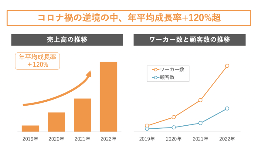 当社は「高齢者の生きがいを創出し、ぴんぴんころり社会をつくる」をビジョンに掲げ、2019年4月のサービス開始から約4年で、お母さん(アクティブシニアワーカー)の登録者数は現在1300名(※1)を突破し、売上も年平均成長率+120%を超えて成長しております。